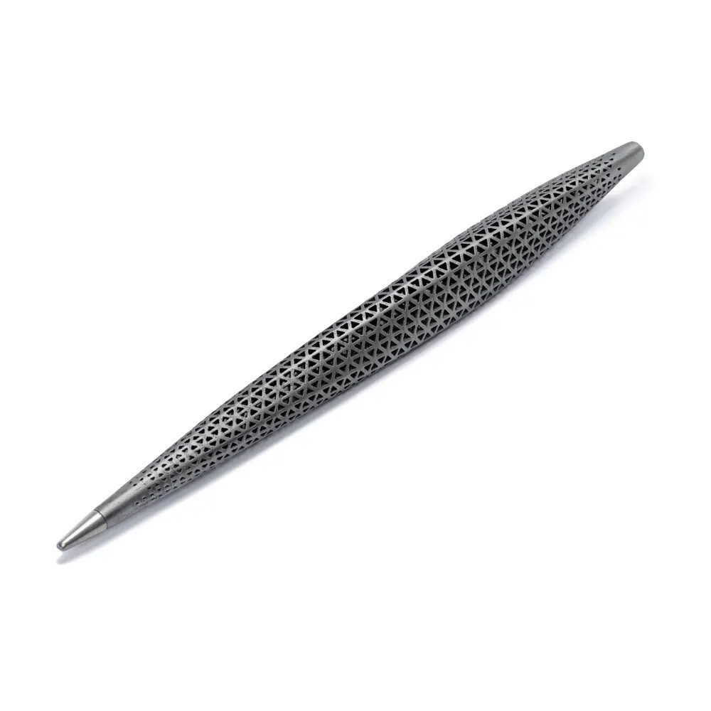 Перфорираният дизайн обхваща цялото тяло на инструмента за писане, кулминирайки в централната част, и подчертава иновативния пишещ връх. 3D отпечатаният алуминий, от който е изработен, го прави изключително лек, а прогресивната перфорация балансира ергономичността на продукта, добавяйки интересен контраст на светлина и сянка. Малък магнит, поставен в областта близо до върха, позволява на инструмента да остане балансиран върху поставката си, предизвиквайки гравитацията и увеличавайки неговата динамика.