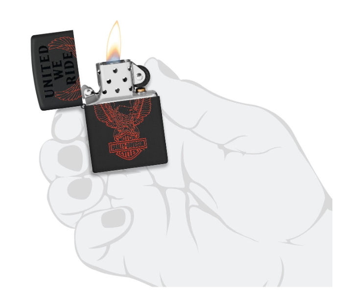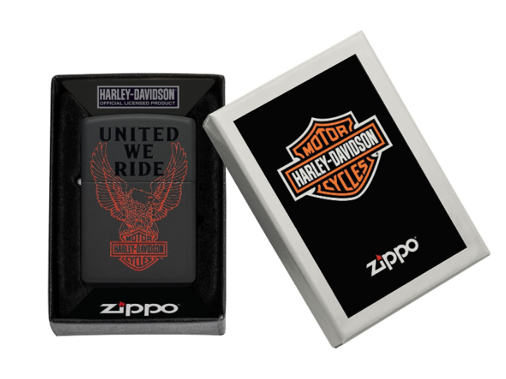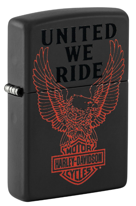 Подкрепено от надписа "United We Ride", орелът, кацнал върху логото на Harley-Davidson®, е основният акцент върху повърхността на тази класическа черна матова запалка. Предлага се в подаръчна кутия.