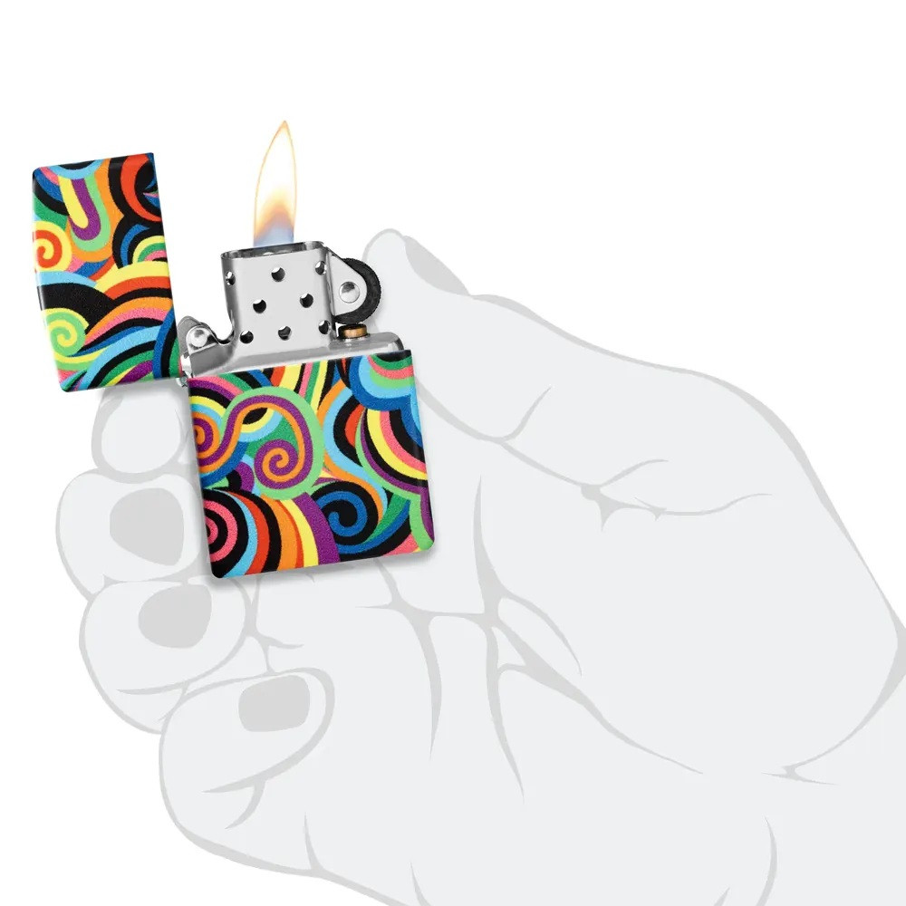 Рик Ритвелд внася своя емблематичен, непринуден артистичен стил върху този дизайн на запалка Zippo. Тя се отличава с безкрайна мрежа от вихрушки от цветове от всички страни, освен това свети в тъмното благодарение на специалното си покритие. Предлага се в подаръчна кутия. За оптимална работа, използвайте само оригинален бензин Zippo.