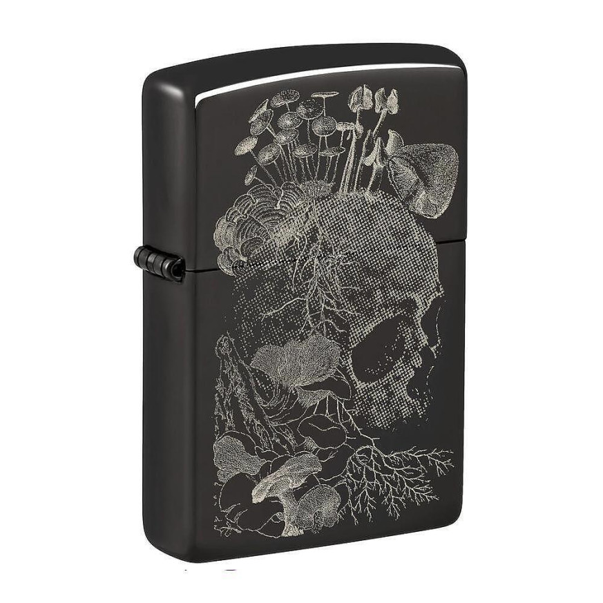 Животът и смъртта са романтично съпоставени в тази зашеметяваща High Polish Black запалка Zippo.